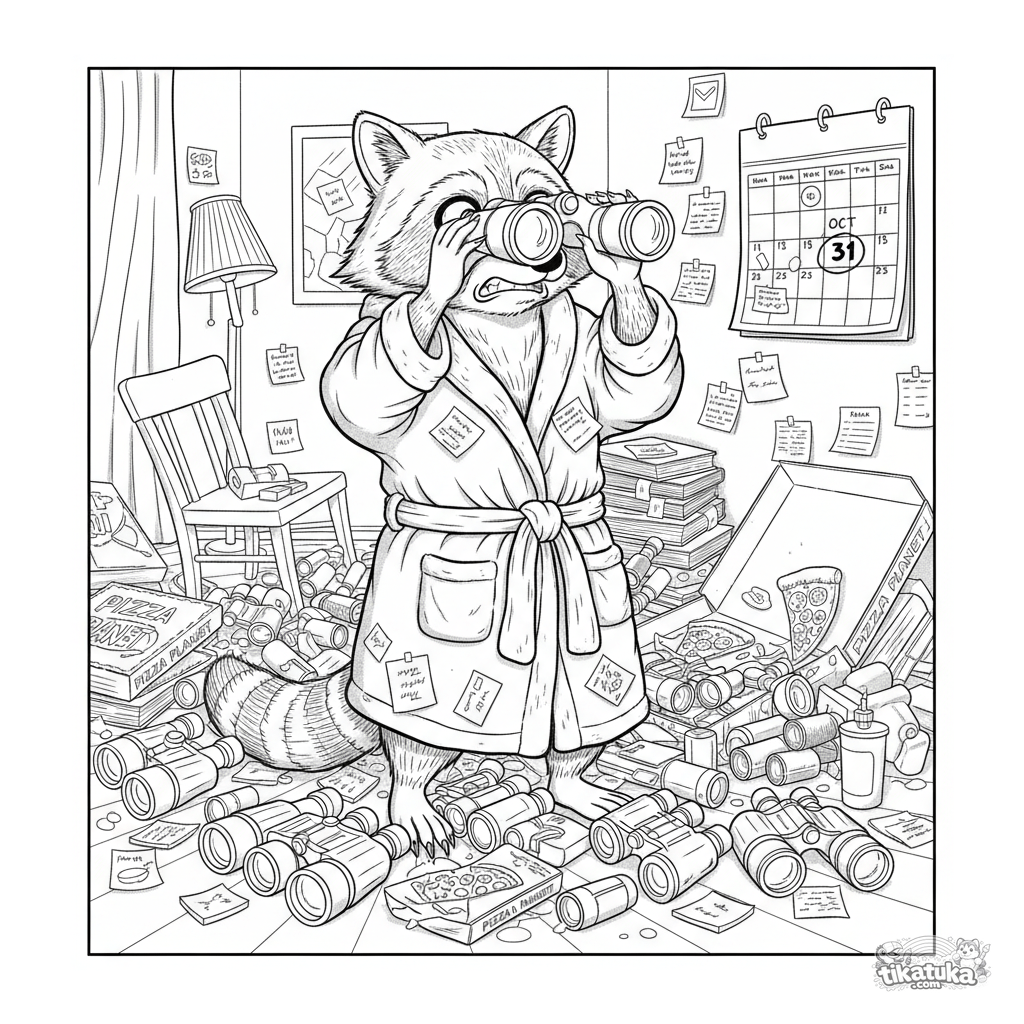 Página para colorear para niños 10-12: un mapache ansioso en una bata en medio de un montón de binoculares en un apartamento desordenado, esperando su pago. Escena detallada en estilo de novela gráfica.