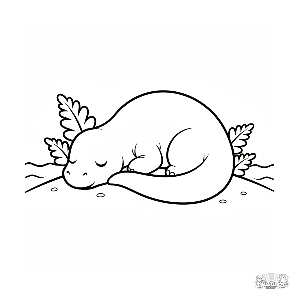 Página muy simple para colorear para niños pequeños 2-3: un enorme apatosaurus duerme acurrucado en una duna de arena. Formas enormes y claras.