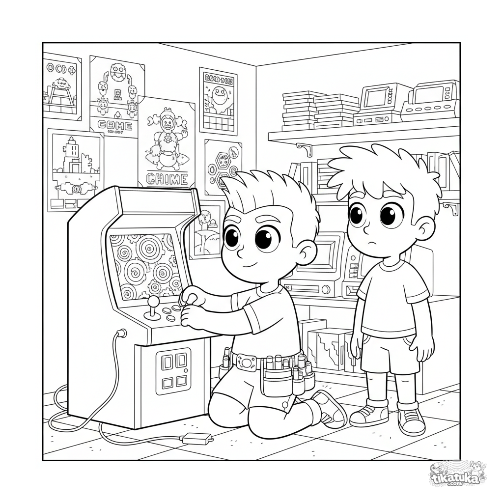 Página para colorear para 10-12 años: un modificador prueba un arcade personalizado en un rincón de juegos subterráneo. Controles detallados, carteles y herramientas para colorear.