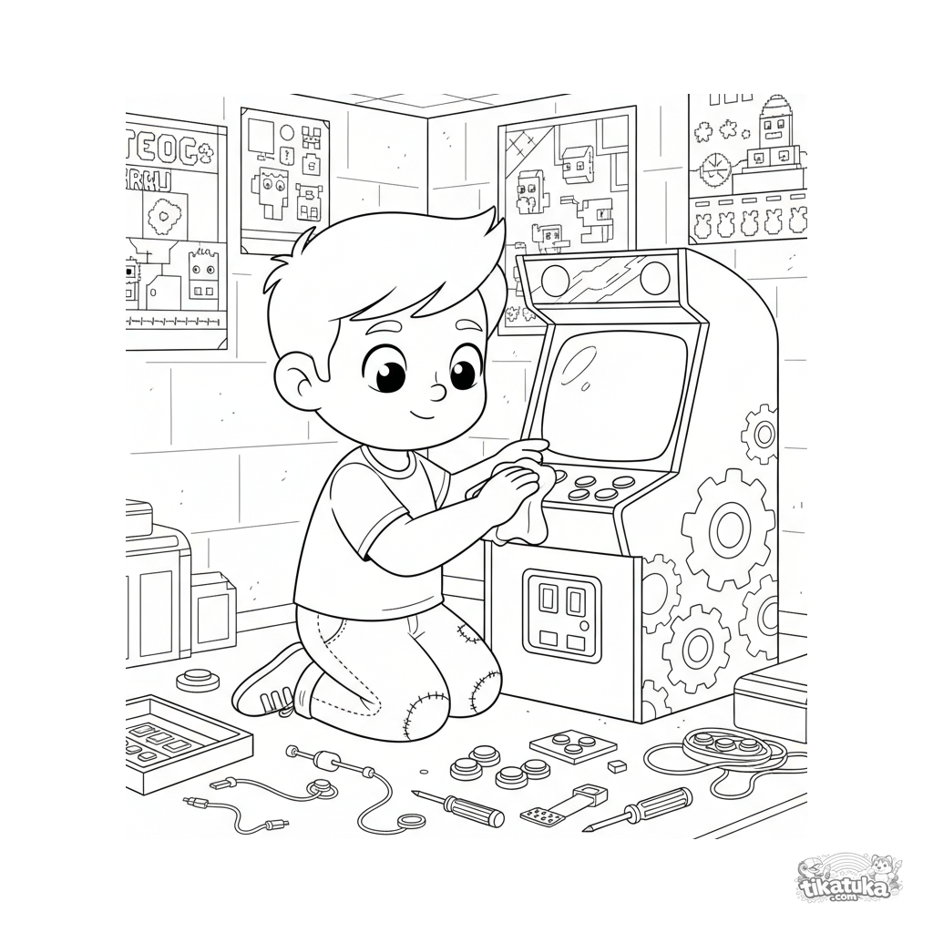 Página para colorear divertida estilo 90: un restaurador de máquina arcade en un sótano, rodeado de herramientas y pósters.