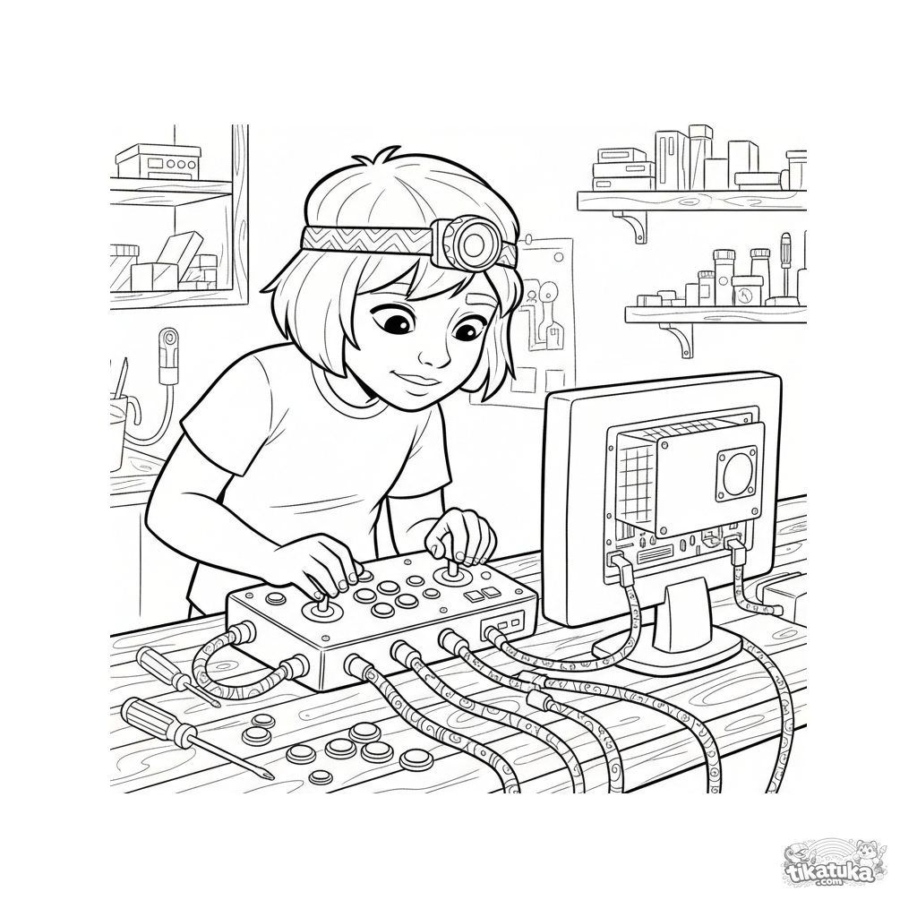 Página para colorear para niños de 10-12 años: un adolescente modder en un taller del sótano probando un joystick de arcade personalizado. Escena detallada con herramientas, cables y un monitor desmontado.