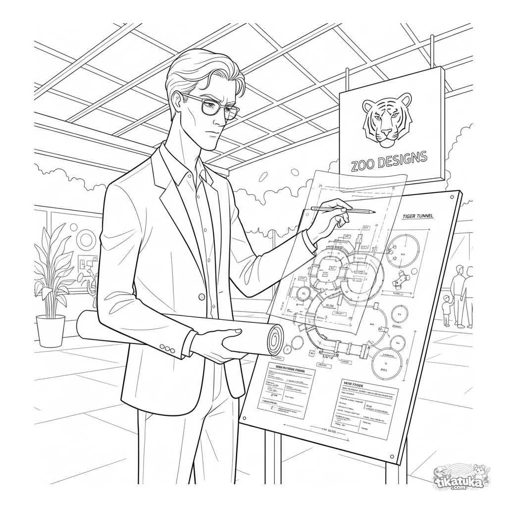 Página para colorear detallada para niños 10-12 años. Un arquitecto con gafas dibuja sobre una transparencia del plano de un nuevo recinto de tigres.