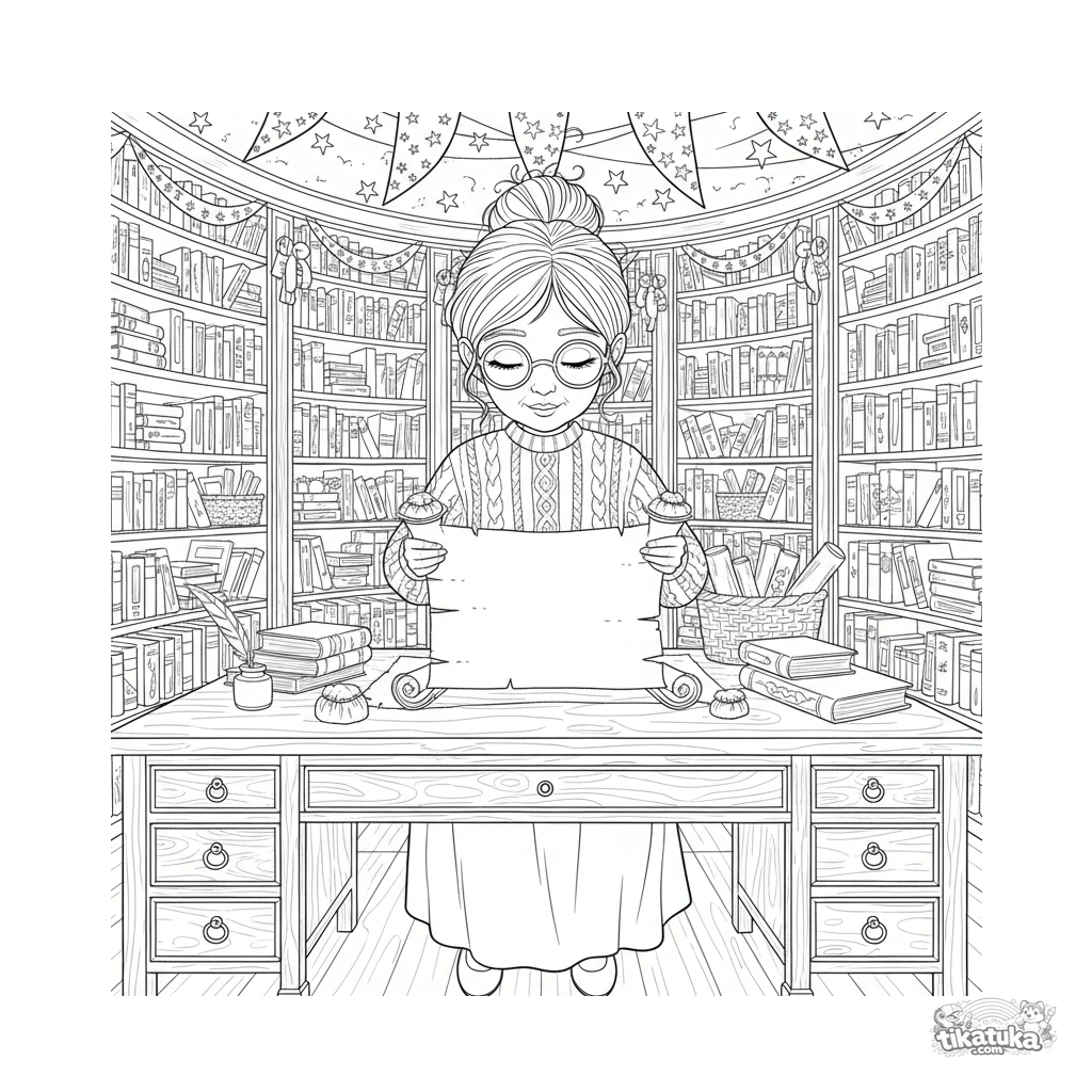 Página para colorear para niños mayores 10-12: una niña preadolescente como archivista organiza cuidadosamente pergaminos antiguos en la biblioteca del salón festivo. Estilo grabado vintage lite, alto detalle.