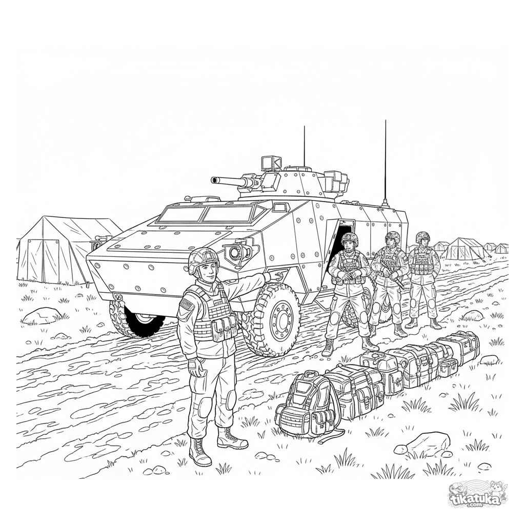 Página detallada para colorear de un APC llegando al cuartel de campo. Para niños mayores 10-12 años. Soldados desembarcando, rampa bajada, incluye tiendas y equipo.