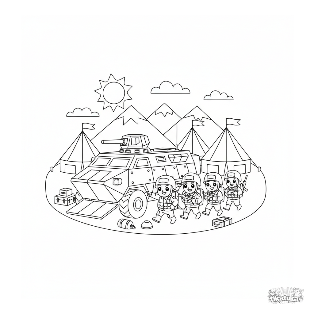 Página para colorear para niños de 7-9 años: un transporte blindado de personal moderno con rampa bajada desembarcando tropas cerca de las carpas del cuartel general. Soldados con equipo completo señalan hacia el centro de mando.