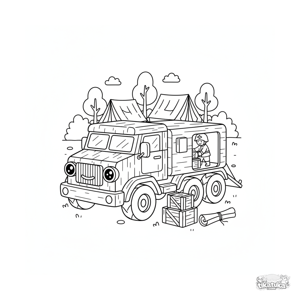 Página para colorear para niños 4-6: un camión blindado entregando cajas de suministros a un cuartel general de campaña con carpas. Formas simples, diseño amigable.