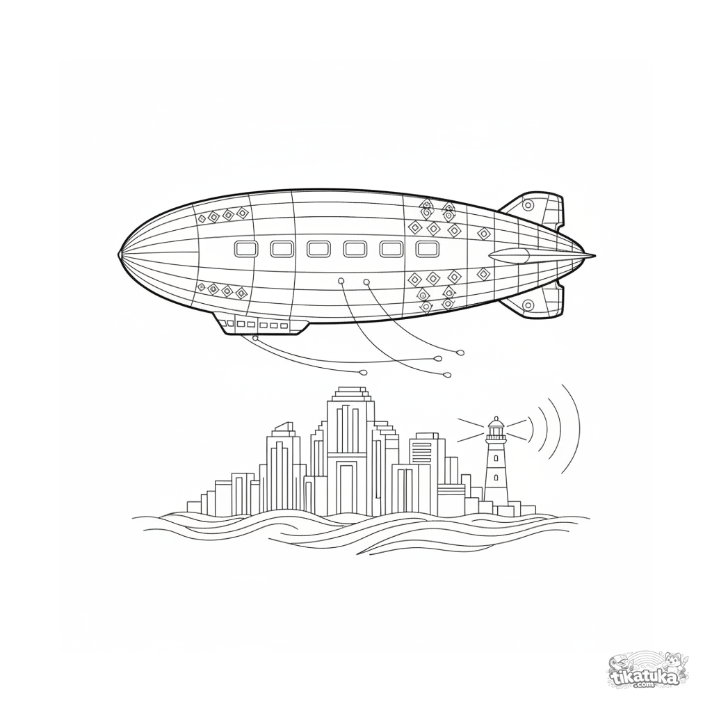 Página detallada para colorear de un zepelín art decó volando sobre una ciudad costera al anochecer. Para 10-12 años. Líneas elegantes, ventanas, paisaje urbano.