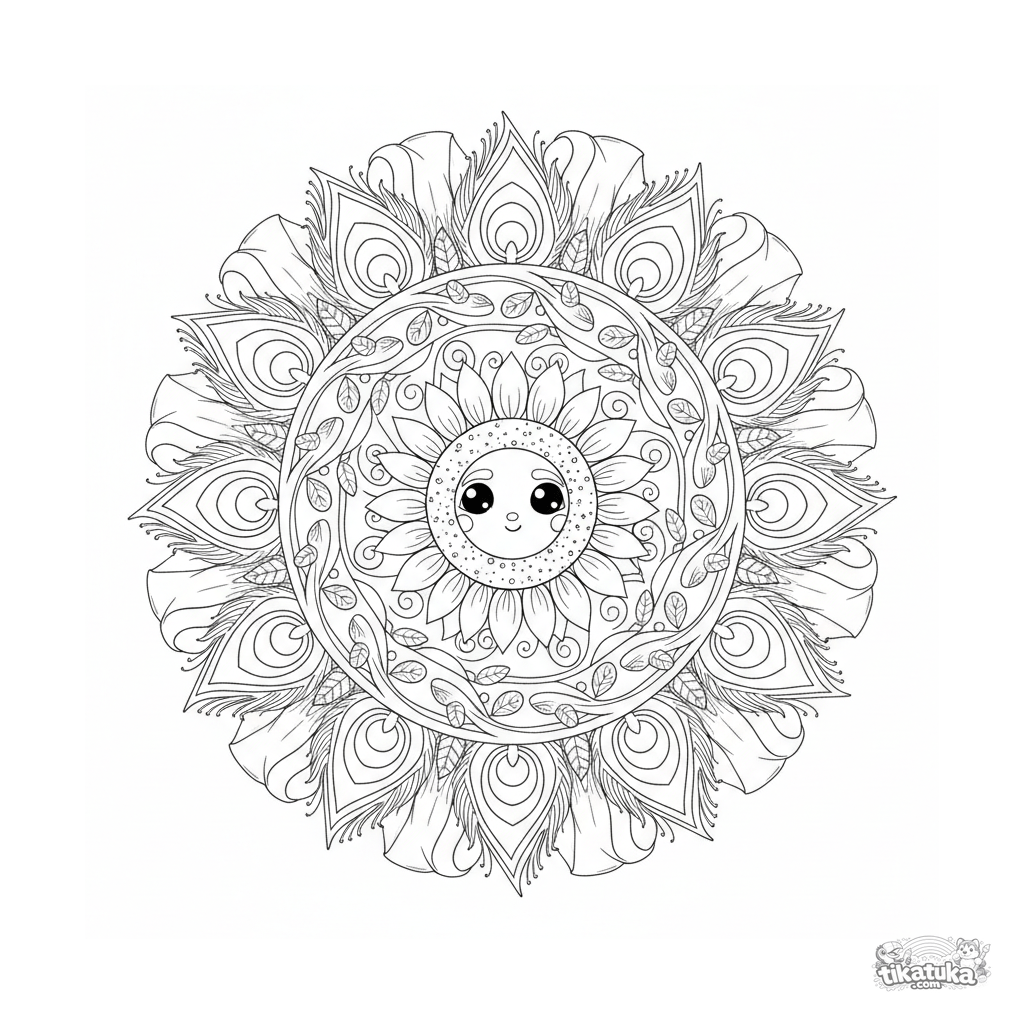 Página para colorear de mandala floral Art Nouveau intrincada para 10-12 años. Centro de girasol, anillos de vides fluidas, plumas de pavo real y lirios. Patrón vintage.