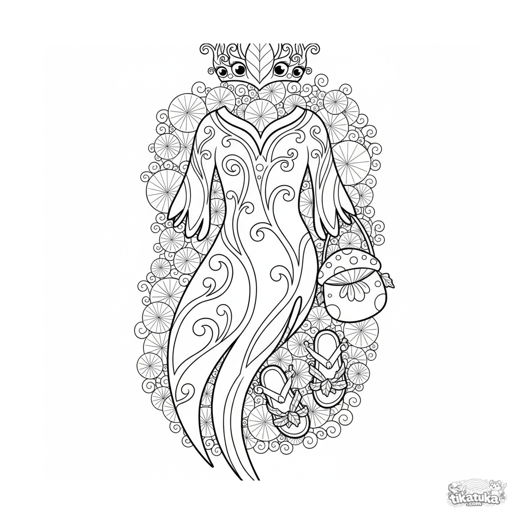 Página para colorear para niñas 10-12: un diseño plano detallado de un atuendo de túnica de duende del bosque en estilo Art Nouveau.