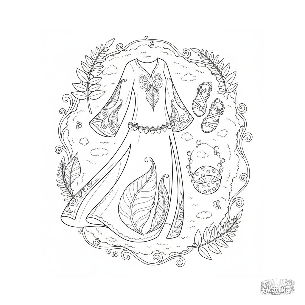 Página para colorear para niñas 10-12: una túnica de duende del bosque inspirada en el Art Nouveau, desplegada sobre musgo con accesorios. Alto nivel de detalle.