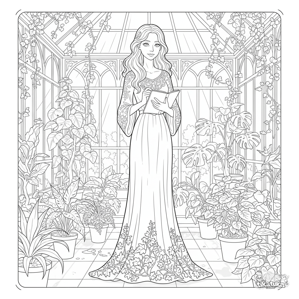 Página para colorear para 10-12 años: vestido Art Nouveau con bordado de hiedra en un invernadero soleado. Escena de alta detalle con entorno inspirador.