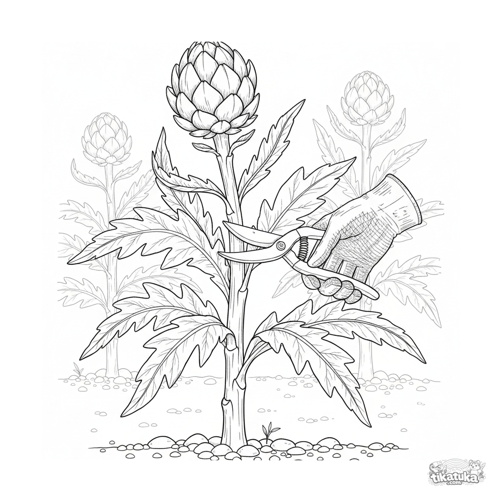 Página para colorear para 10-12 años: escena detallada de cosechar una alcachofa de su planta. Representación realista de guante, tijeras y hojas, tema educativo.