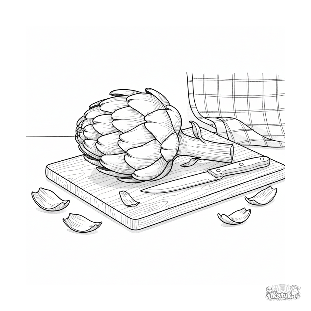 Página detallada para colorear de una alcachofa en una tabla de cortar en una cocina. Para niños de 10-12 años. Estilo realista de acuarela-boceto.