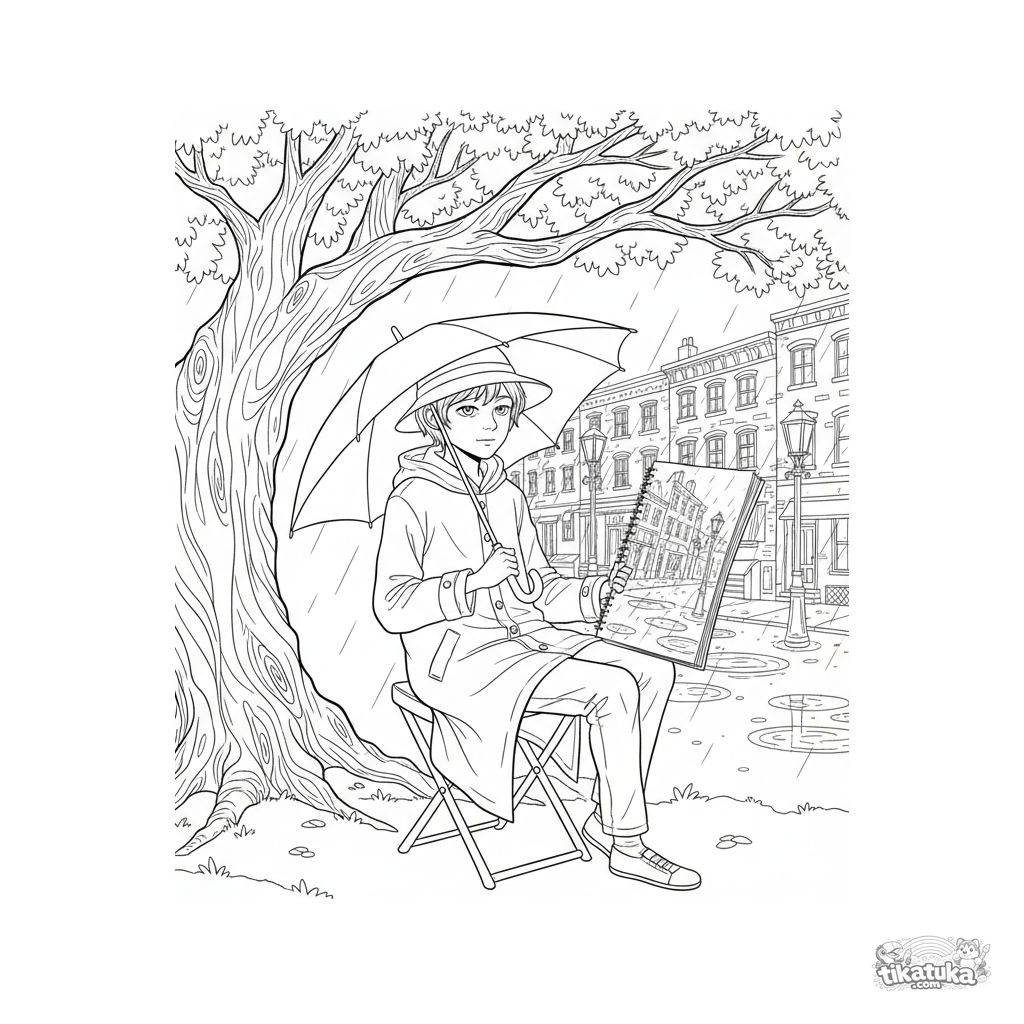 Página para colorear para niños mayores de 10-12 años: un joven artista con impermeable dibuja una escena detallada de una calle lluviosa de otoño. Alta complejidad, escena atmosférica.