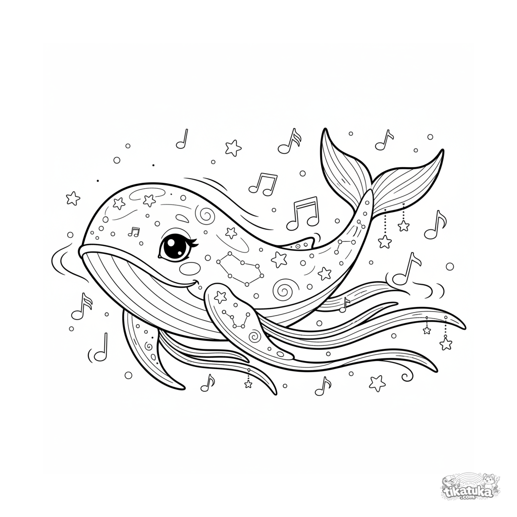 Página detallada para colorear para niños mayores 10-12: una grácil ballena astral con cuerpo estrellado nada por un mar lleno de notas musicales flotantes.