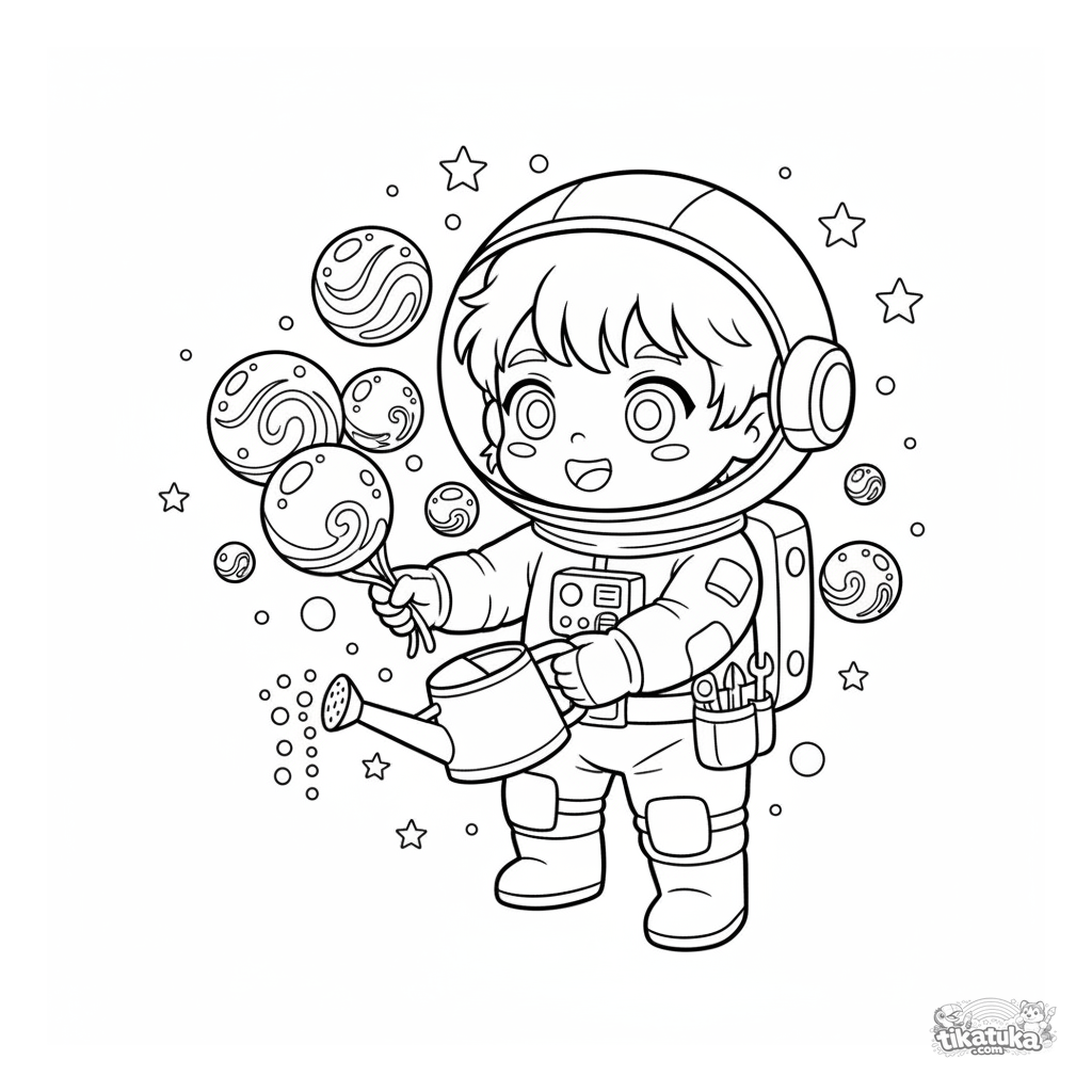 Página para colorear para niños de 4-6 años: un jardinero espacial alegre cuida plantas brillantes que flotan a su alrededor en el espacio exterior.
