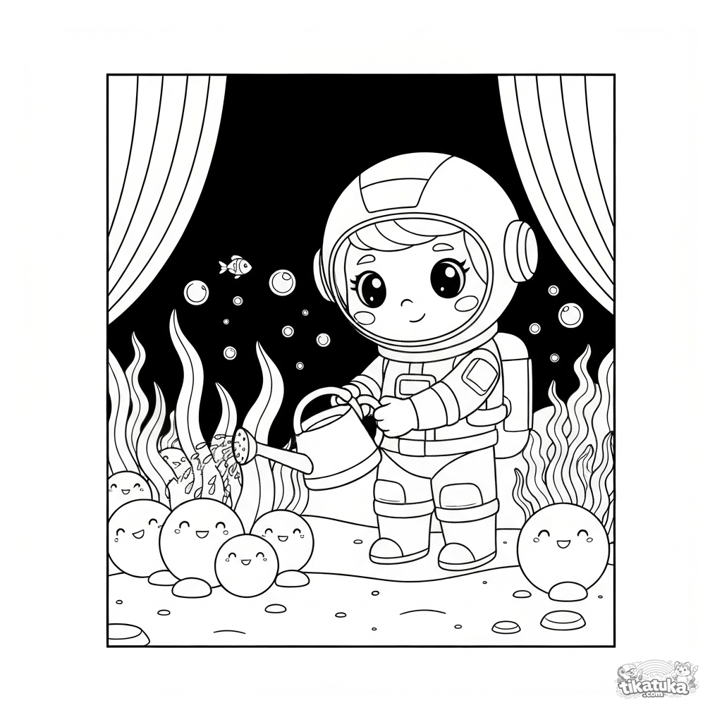 Un alegre astronauta en traje espacial riega amigables plantas marinas en un jardín submarino mágico. ¡Colorea las algas brillantes y las burbujas de aire!