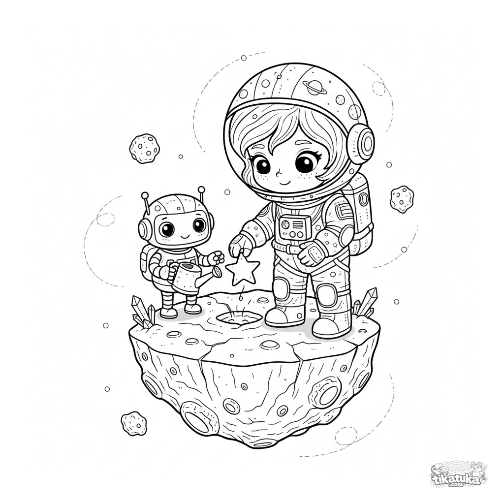 Página para colorear para 7-12 años: una niña astronauta planta una semilla mágica en un asteroide. Escena detallada con un robot y planetas.