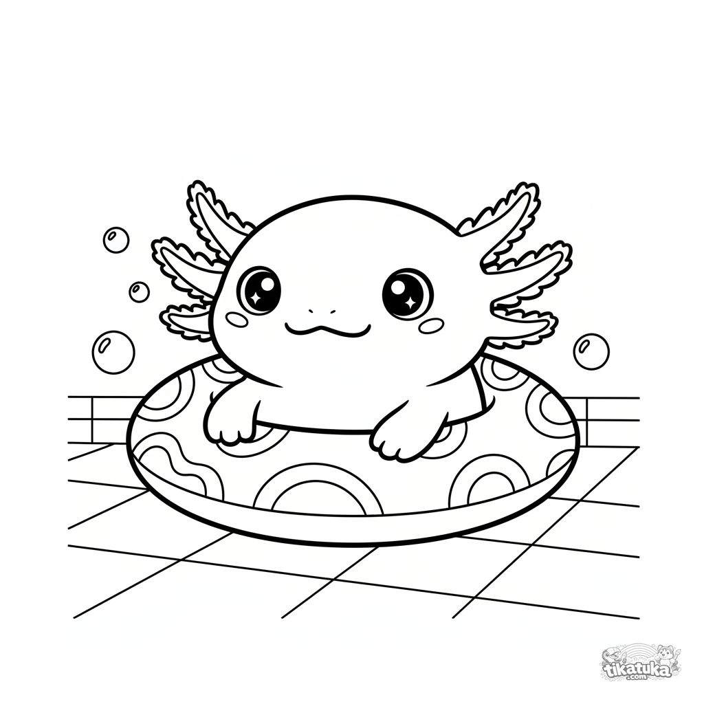 Página para colorear para niños de 4-6 años: un lindo ajolote descansa en un anillo inflable en el fondo de una piscina. Líneas claras y simples, expresión dulce.