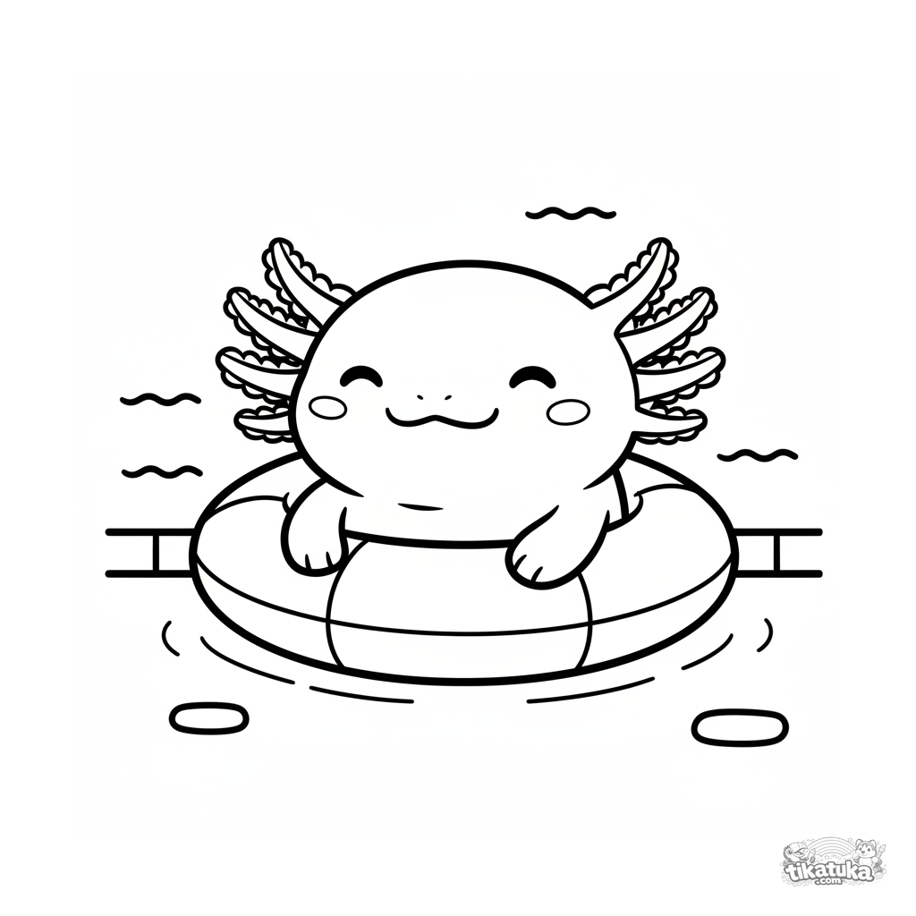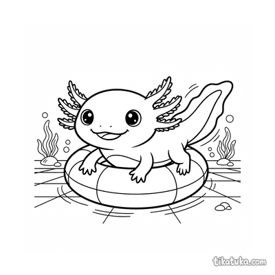 Página para colorear para bebés: un lindo ajolote descansa en un anillo inflable en el fondo de una piscina. Formas grandes y simples con amplios márgenes para colorear fácilmente.