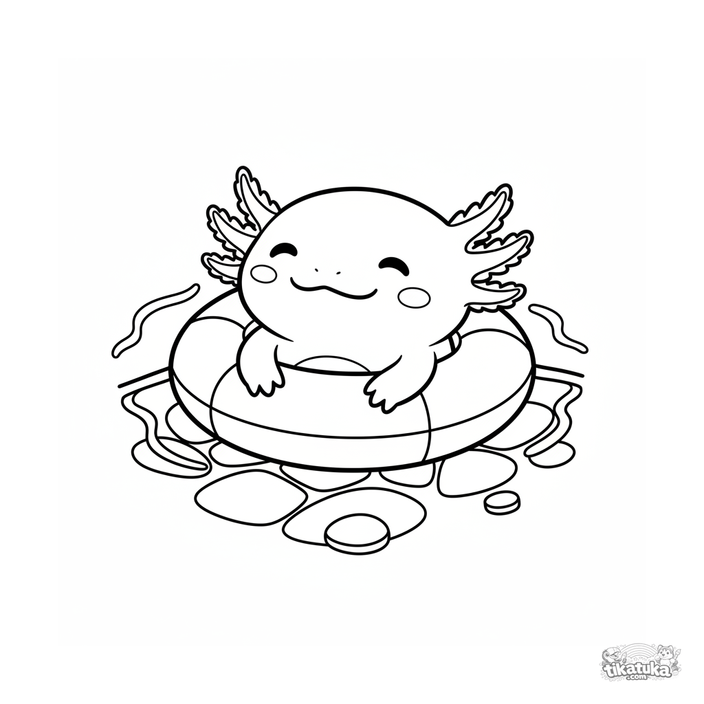 Página para colorear para pequeños: un lindo ajolote descansa en un aro inflable en el fondo de la piscina. Formas grandes y simples con amplios márgenes.