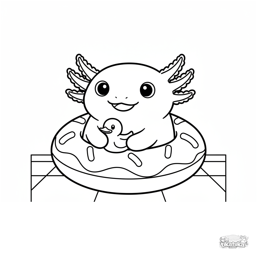 Página para colorear para niños pequeños: un lindo ajolote se relaja en un flotador en el fondo de una piscina. Formas grandes y simples con amplios márgenes blancos.