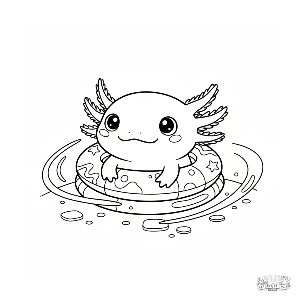Página para colorear de un lindo ajolote descansando dentro de aros inflables en el fondo de una piscina. Escena simple y dulce para niños de 4-6 años.