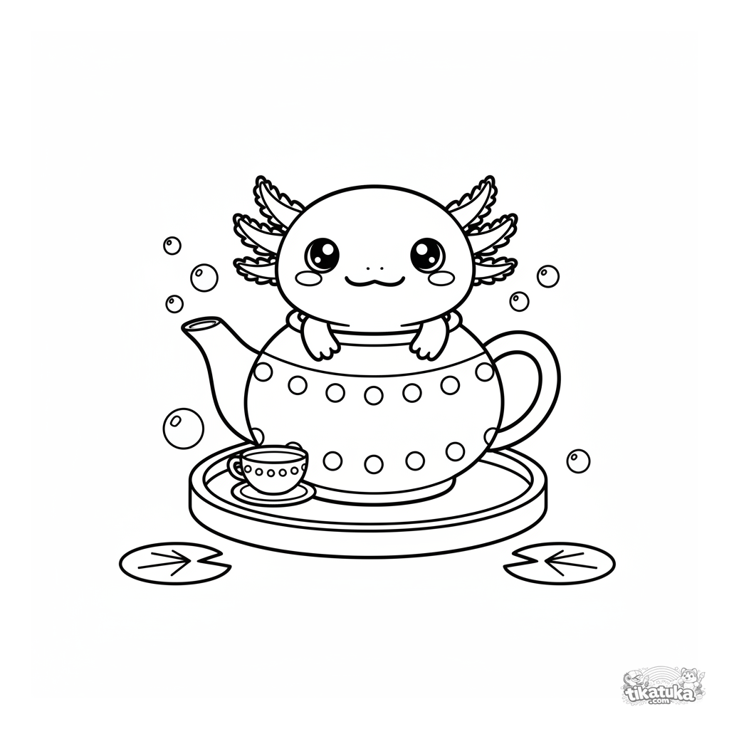 Página para colorear fácil y linda para niños pequeños 2-3 años: un ajolote con grandes ojos estrellados asomándose por el pico de una tetera de cerámica con patrones.
