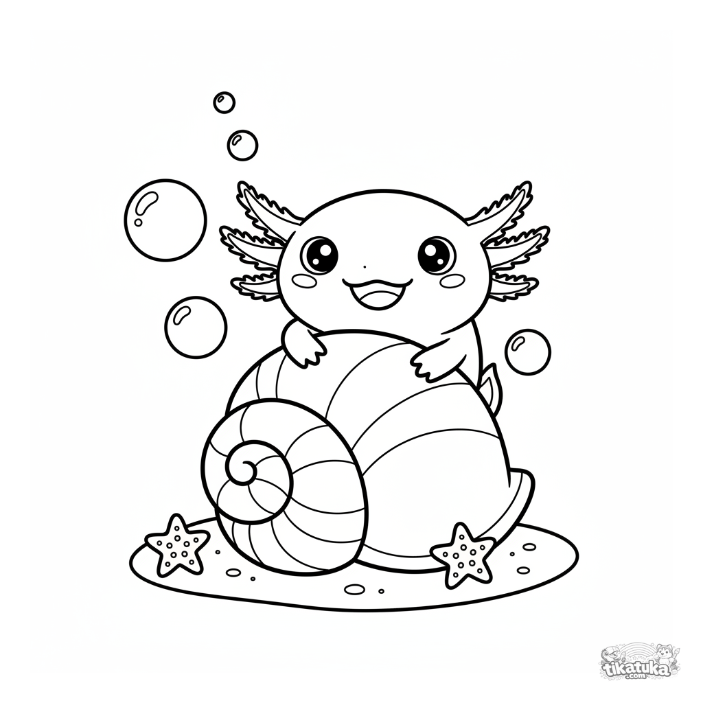Página para colorear simple para niños pequeños con un ajolote lindo asomándose de una concha gigante. Formas grandes, burbujas y márgenes amplios.