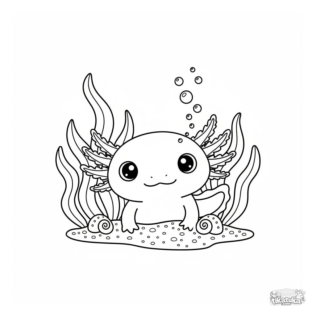 Una página para colorear de Ajolotes y agua kawaii con detalle Medio. Es adecuada para edades 4-7 años, se imprime bien en casa y se abre enseguida en modo en línea.