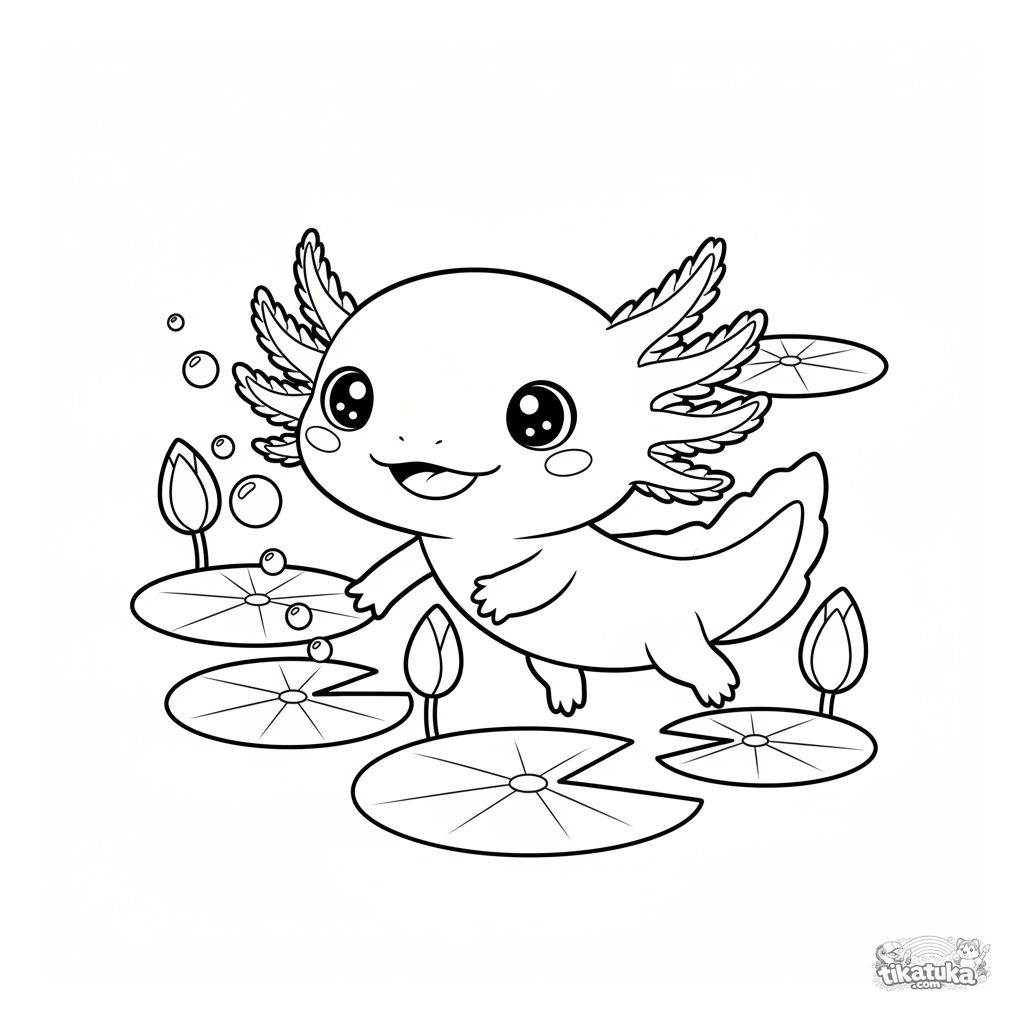 Página para colorear para niños de 4-6 años con un ajolote nadando entre nenúfares en un estanque. Escena submarina juguetona y serena con burbujas.