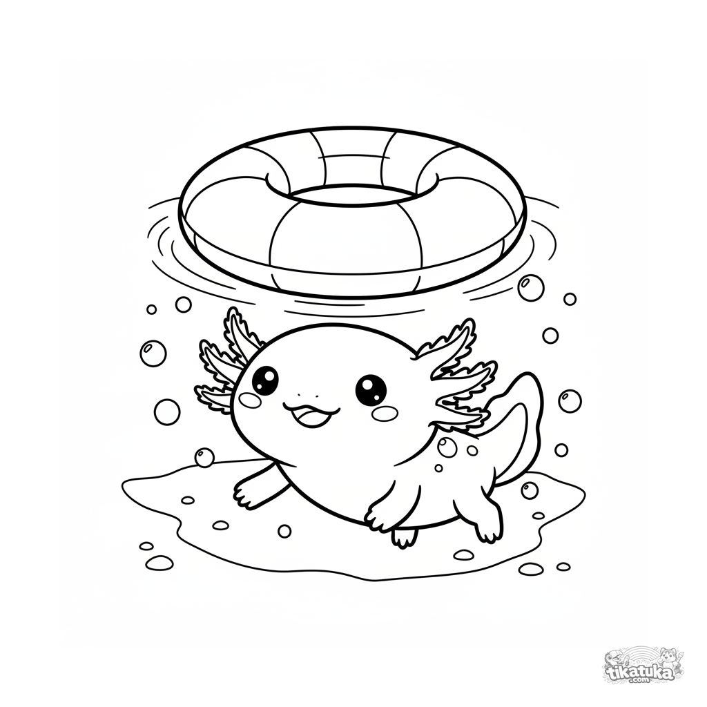 Página para colorear para niños de 4-6 años: un ajolote sonriente nada bajo un aro inflable en el fondo de una piscina. Rasgos tiernos y burbujas para colorear.