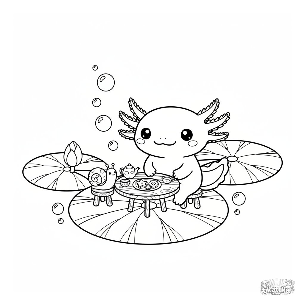 Página para colorear kawaii para niños de 4-6 años: un ajolote sonriente organiza una fiesta de té delicada en un nenúfar gigante para sus amigos insectos.