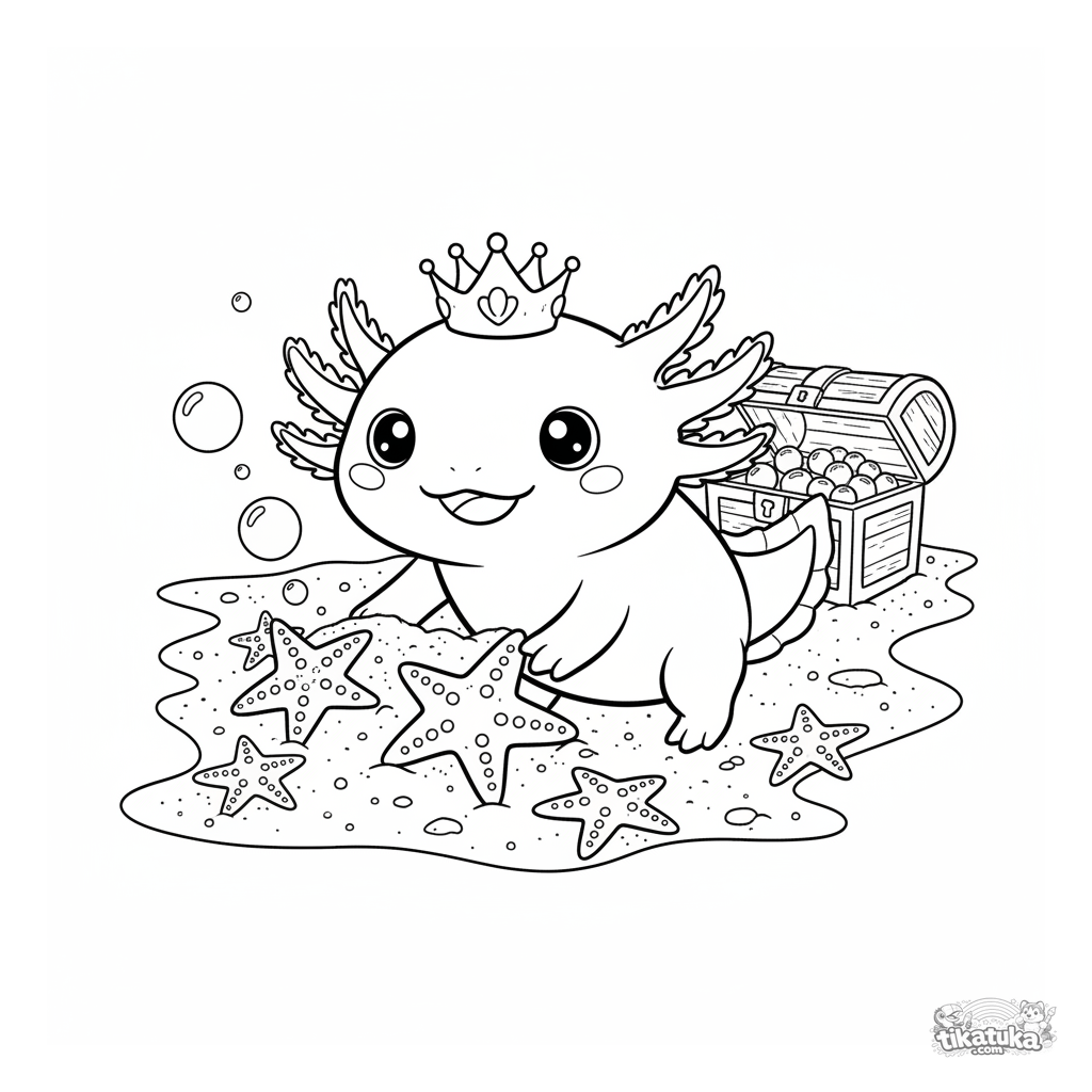Página para colorear para niños de 4-6 años: un lindo ajolote con corona de conchas juega con estrellas de mar en el fondo arenoso del océano, burbujas suben.