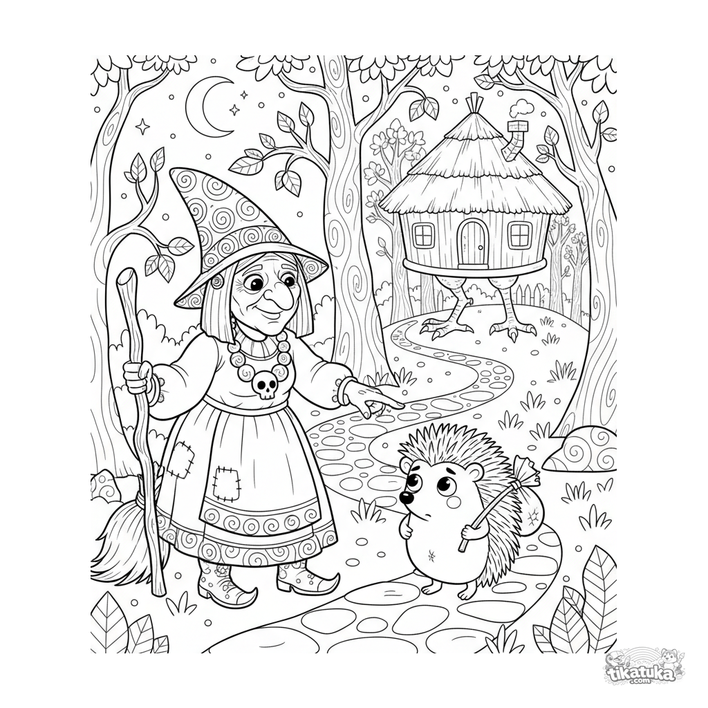 Página para colorear basada en un cuento ruso para niños de 7-12 años: Baba Yaga le da direcciones a un erizo perdido al anochecer, con su cabaña con patas de gallina al fondo. Escena detallada.