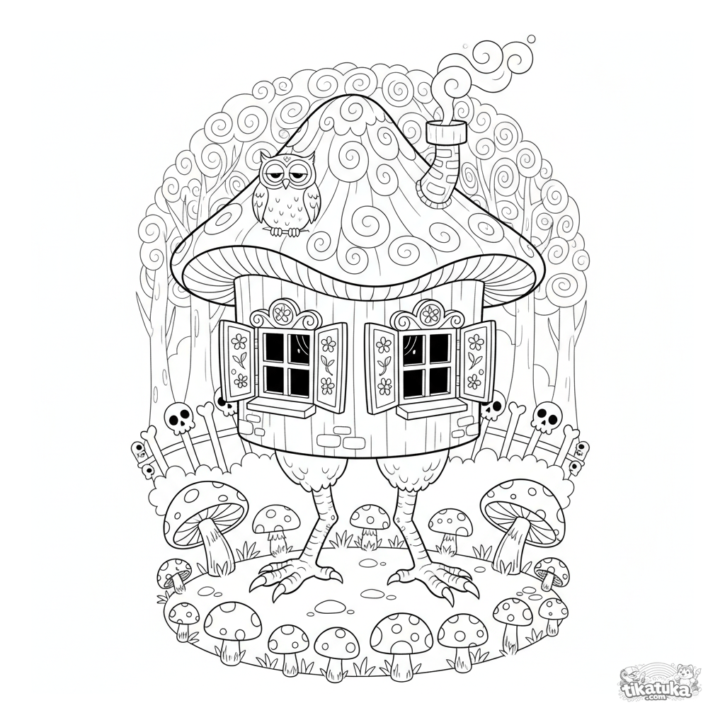 Página difícil para colorear para niños de 7-12 años: la choza mágica de Baba Yaga sobre patas de gallina descansa en un claro del bosque, rodeada por un anillo de hongos. Escena detallada de un cuento ruso.