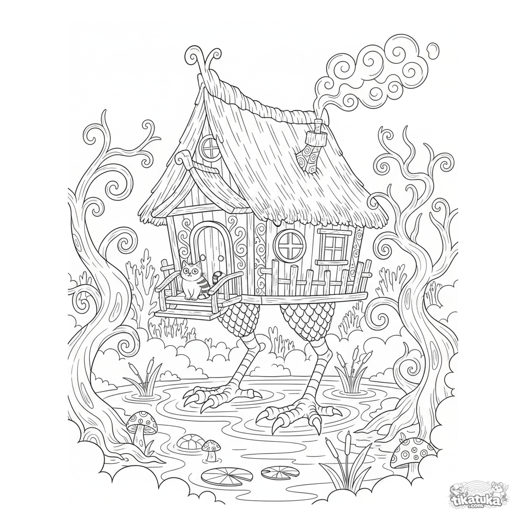 Página para colorear de un cuento ruso: la cabaña de Baba Yaga sobre patas de pollo en un pantano. Para niños de 7-12 años. Anochecer, niebla, árboles torcidos y un gato.