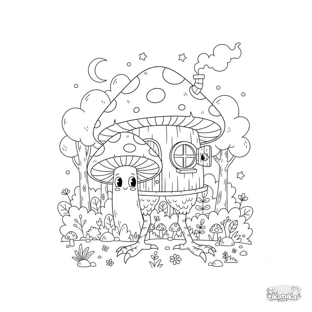 Página para colorear para niños 4-6 años de un cuento ruso: la cabaña de Baba Yaga con patas de gallina asoma tras una seta gigante en el bosque. Escena icónica.
