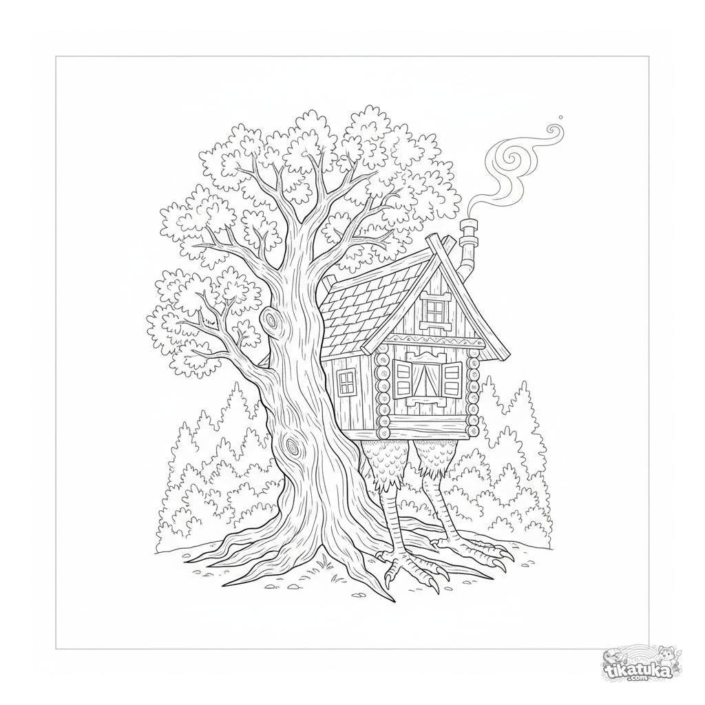 Página para colorear para niños de 7-12 años: la famosa choza de Baba Yaga sobre patas de gallina se asoma tras un roble viejo en un bosque oscuro. Escena mística detallada.