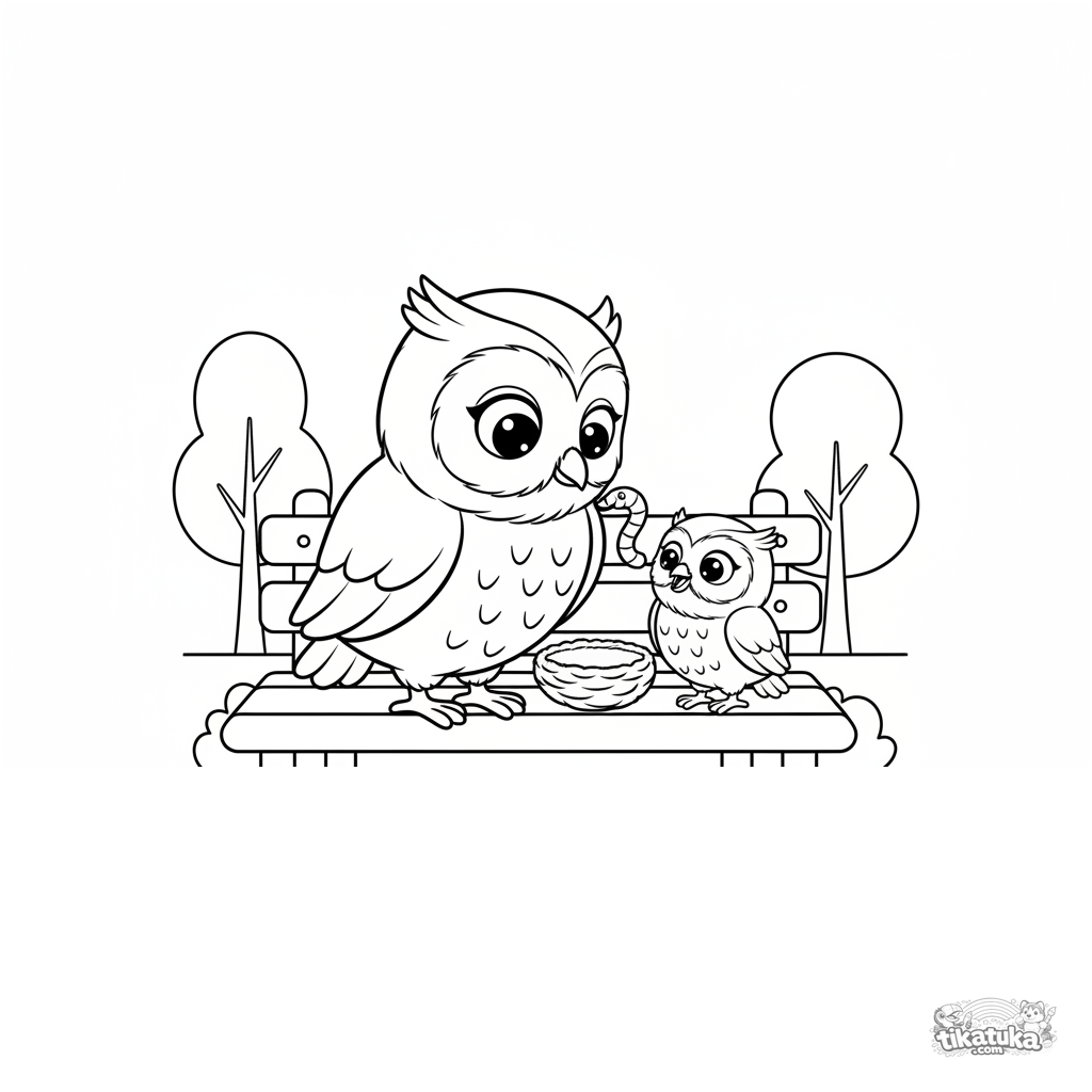 Página muy simple para colorear para niños pequeños 2-3: un búho amable alimenta a un pequeño polluelo en un banco del parque. Formas grandes y claras.