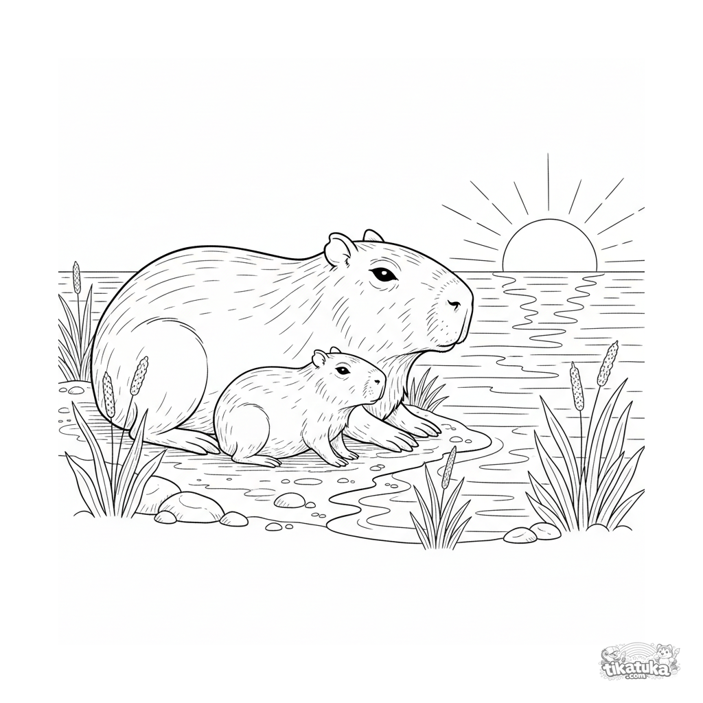 Página para colorear realista para 10-12 años: un bebé capibara y su padre en la orilla del río miran el atardecer. Escena de cercanía familiar y asombro.