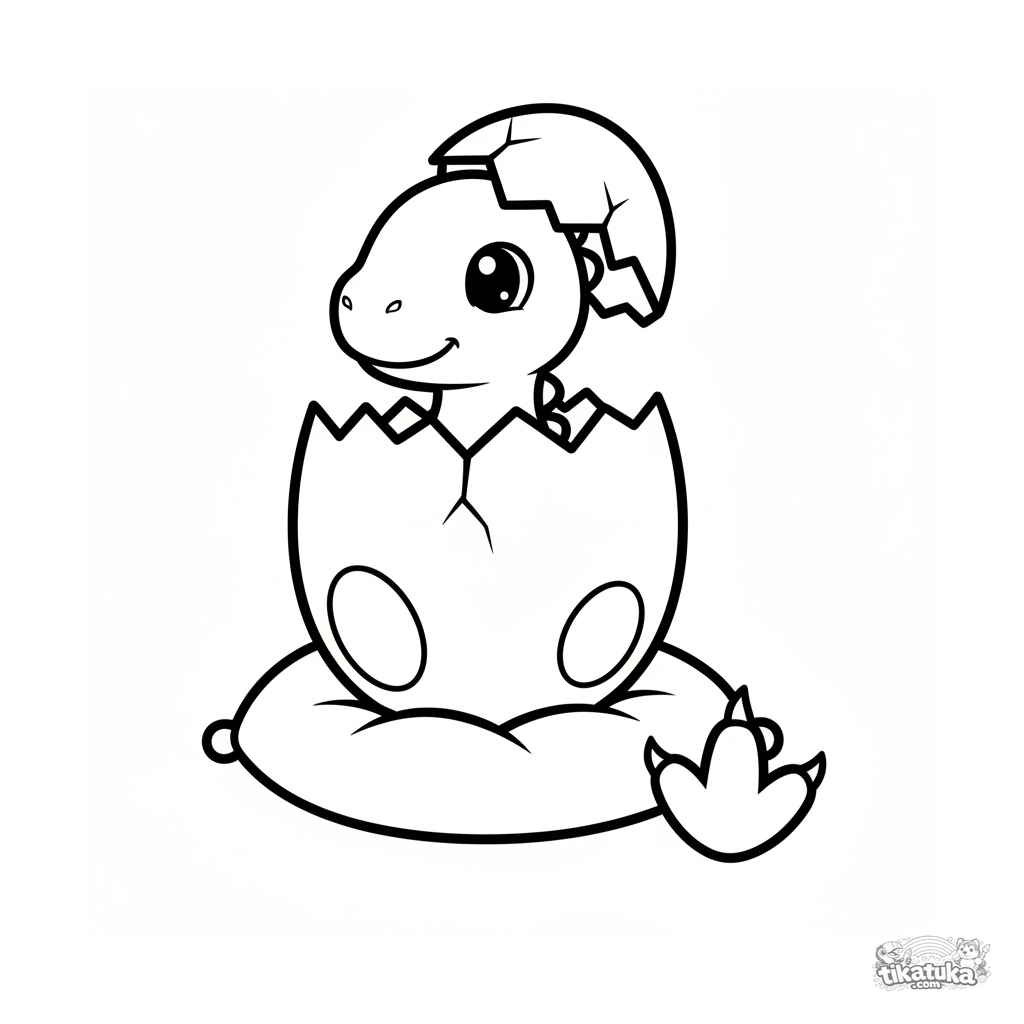 Página para colorear para los más pequeños: un huevo de dinosaurio con un bebé asomándose descansa en una almohada. Formas simples, una gran huella al lado, amplios márgenes para colorear.