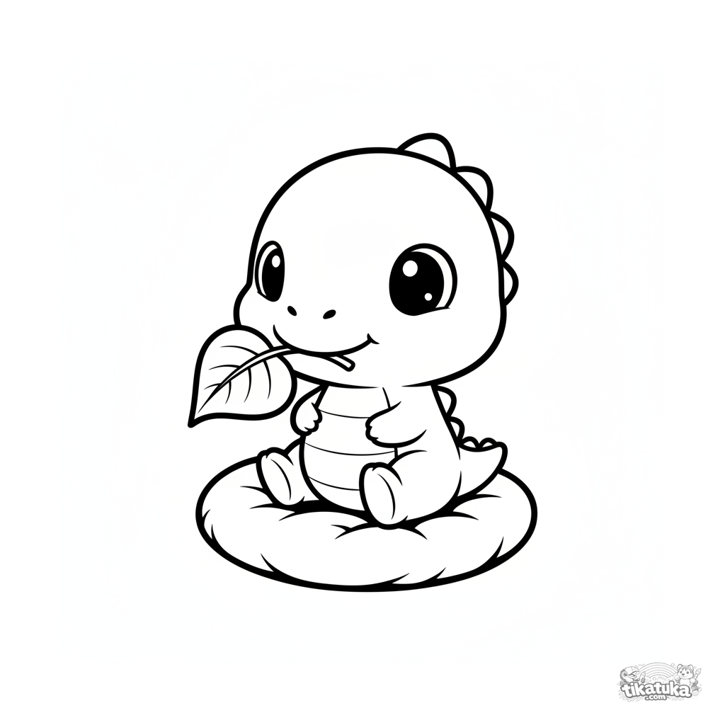 Página para colorear para 2-3 años: un lindo bebé dinosaurio con una hoja en la boca sentado en una almohada. Cabeza grande, formas simples, márgenes amplios.