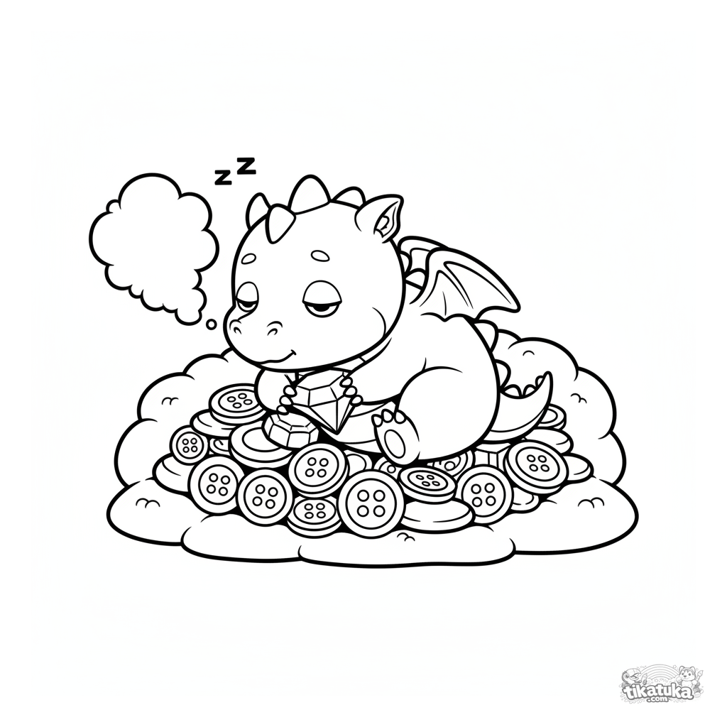 Página simple para colorear para niños pequeños 2-3: un tierno bebé dragón duerme en un montón de chucherías brillantes. Formas grandes y claras, pocos detalles.