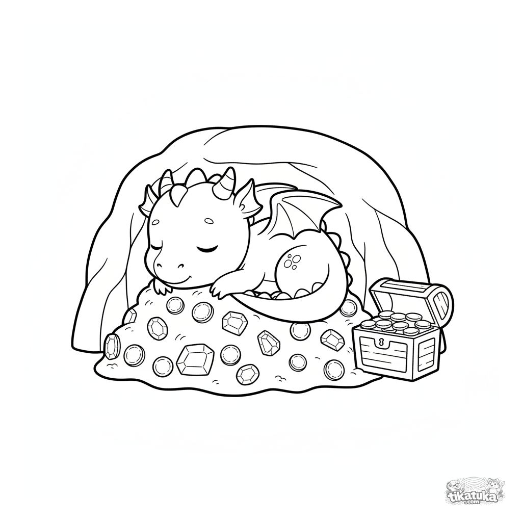 Página para colorear fácil para niños pequeños de 2-3 años con un bebé dragón durmiendo en un tesoro de gemas. Formas grandes y márgenes amplios.