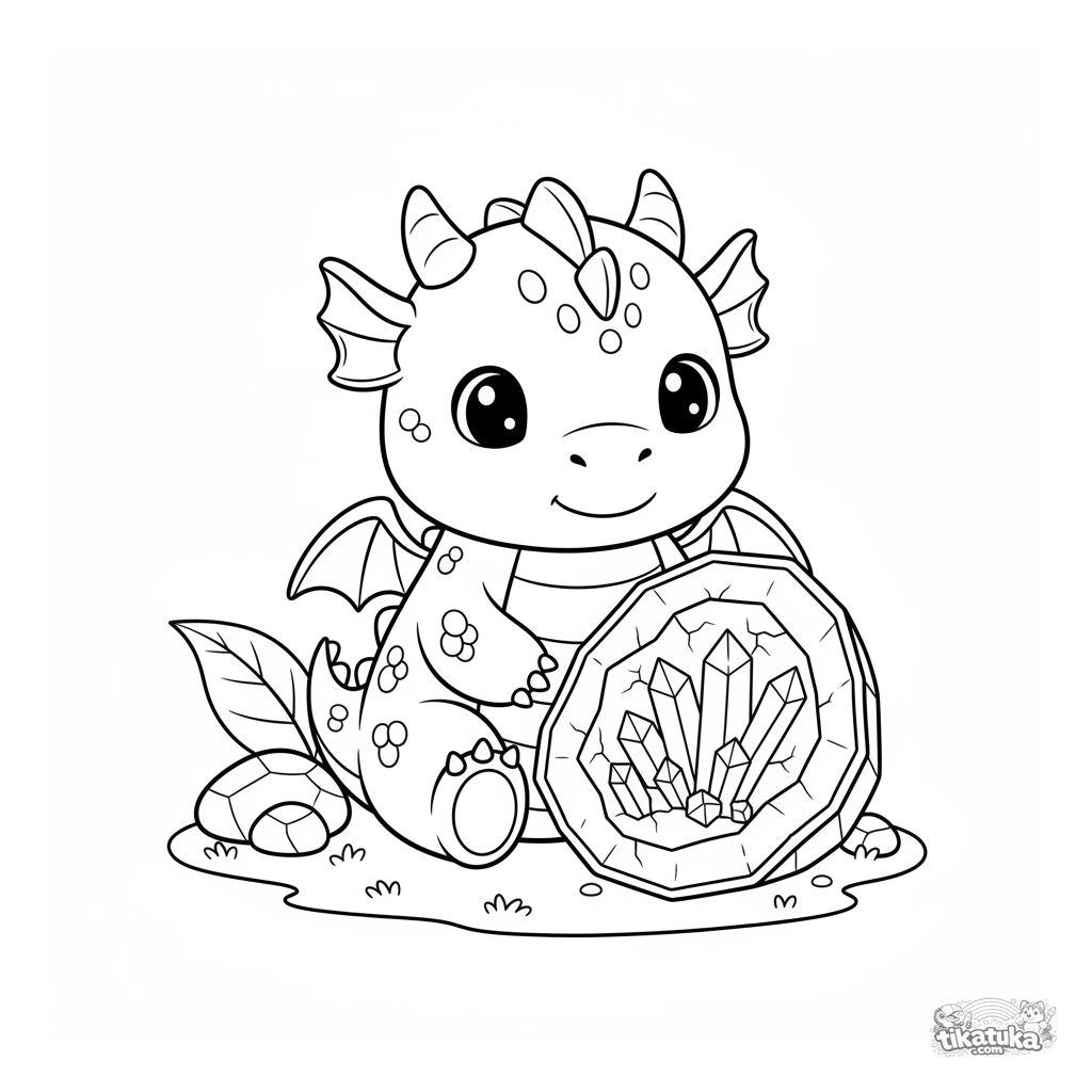 Página para colorear para niños: un lindo bebé dragón con cuernos pequeños guardando una geoda agrietada con cristales en tierra musgosa.