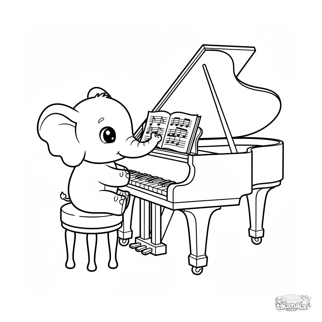Página para colorear simple para niños pequeños 2-3: un lindo bebé elefante explora un gran piano de cola en el escenario.
