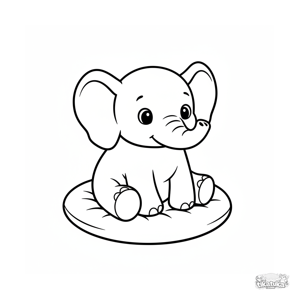 Página para colorear para los más pequeños: un elefantito de peluche se sienta en un cojín. Silueta reconocible y clara, líneas simples.
