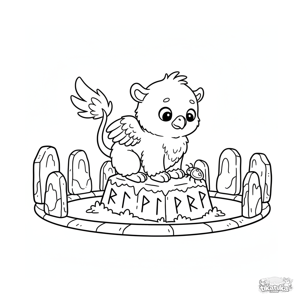 Página para colorear para niños pequeños: un esponjoso bebé grifo posado en una antigua piedra rúnica. Líneas simples, formas grandes, perfecto para niños de 2-3 años.