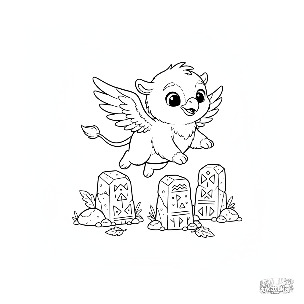 Página para colorear de un bebé grifo jugando entre antiguos monolitos rúnicos. Para niños de 4 a 6 años. Criatura mítica en un entorno mágico.